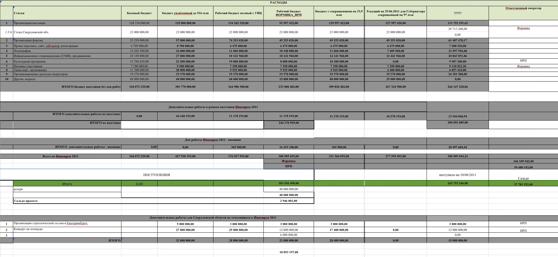 Эксперты агентства не готовы дать оценку представленным данным. Но необходимо отметить, что в таблице, предположительно созданной в компании «Формика», представлено 7 (семь!) разных смет выставки «Иннопром-2011». Различные сметы в этой таблице отличаются друг от друга на 150 (сто пятьдесят) миллионов рублей.