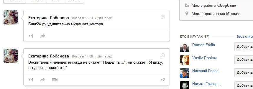 Когда в защиту обиженного банка из Екатеринбурга выступили его сторонники (некоторые из них, кстати, заявляли о себе и как о клиентах Сбербанка) — досталось и простым пользователям. Екатерина Лобанова не стеснялась в выражениях и не ограничивала свой актуальный словарный запас цензурными фразами.