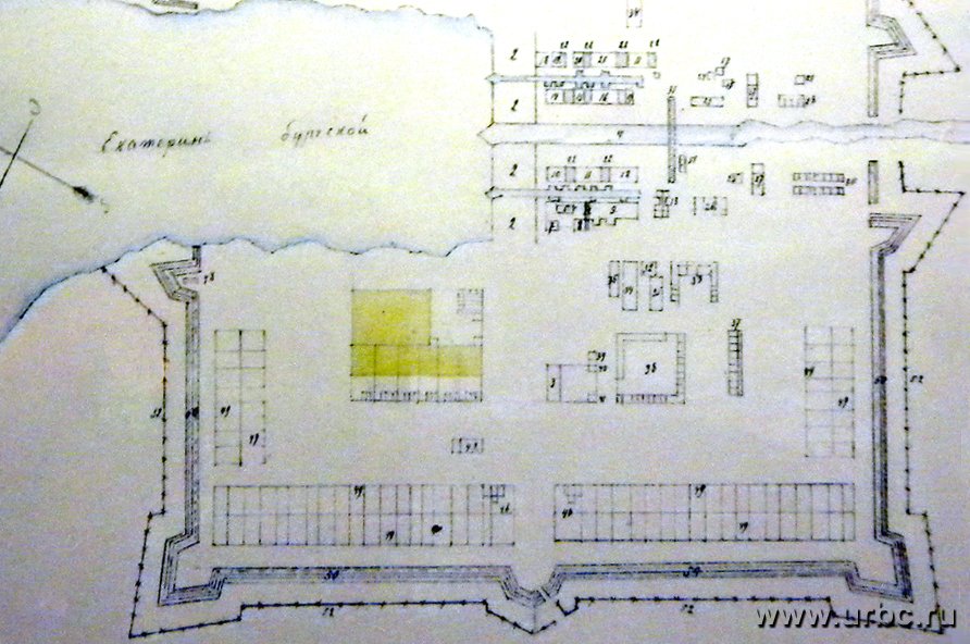 Так выглядела территория набережной Рабочей Молодежи в 1726 году. На чертеже видно, что она находилась в пределах екатеринбургской крепости