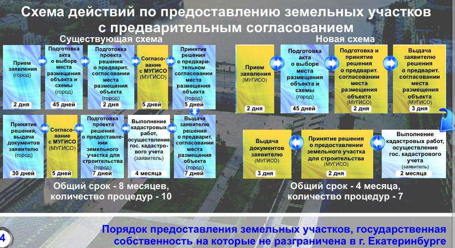 Вчера был опубликован предполагаемый порядок предоставления земельных участков, находящихся на неразграниченных землях (земли, государственная собственность на которые не разграничена) Екатеринбурга. Согласно схеме, весь срок должен сократиться с 8 до 4 месяцев, а количество операций должно снизиться в среднем с 10 до 7. При этом значительно, с 4 до 2 месяцев, должно снизиться количество времени, выделяемое на выполнение кадастровых работ и осуществление кадастрового учета. Агентство УрБК попросило экспертов проанализировать, за счет чего могут быть снижены сроки и насколько это реально.