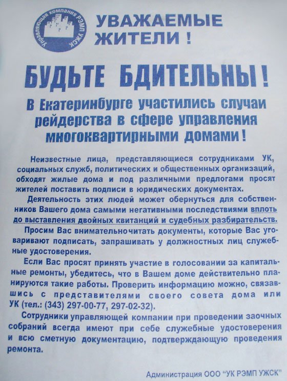 С официальным обращением к жителям Чкаловского района выступило ООO «Управляющая компания Ремонтно-эксплуатационное многопрофильное предприятие Уралжилстройкомплекс» (ООО «УК РЭМП УЖСК»). В нем говорится, что неизвестные лица, которые представляются сотрудниками УК, социальных служб, а также членами партийных и общественных организаций, ходят по домам и под различными предлогами просят жильцов поставить свои подписи под юридическими документами.