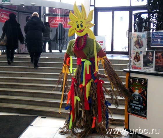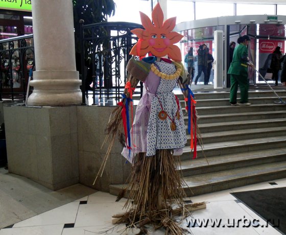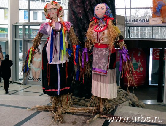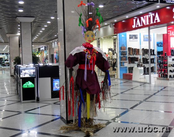 Организаторы мероприятия украсили весь торговый центр двухметровыми и миниатюрными чучелами Маслениц, выполненными по образу тех, которые устанавливались в царских дворах.