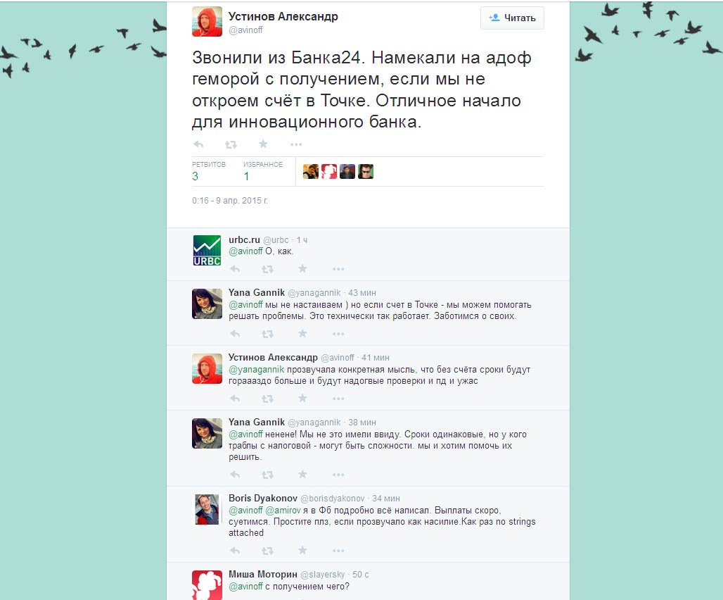 «Звонили из Банка24. Намекали на адоф геморрой с получением, если мы не откроем счёт в «Точке». Отличное начало для инновационного банка», — написал в своем «Твиттере» основатель компании BeaversBrothers Александр Устинов (авторская орфография сохранена).
