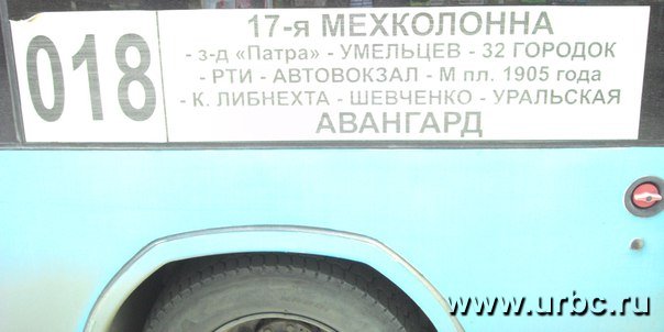 УрБК, Екатеринбург, 09.07.2015. В Екатеринбурге информация на маршрутных автобусах № 18, которые находятся в собственности ООО «Ю-Ви-Эй-Транс», содержит ошибку в названии улиц, по которым они передвигаются.