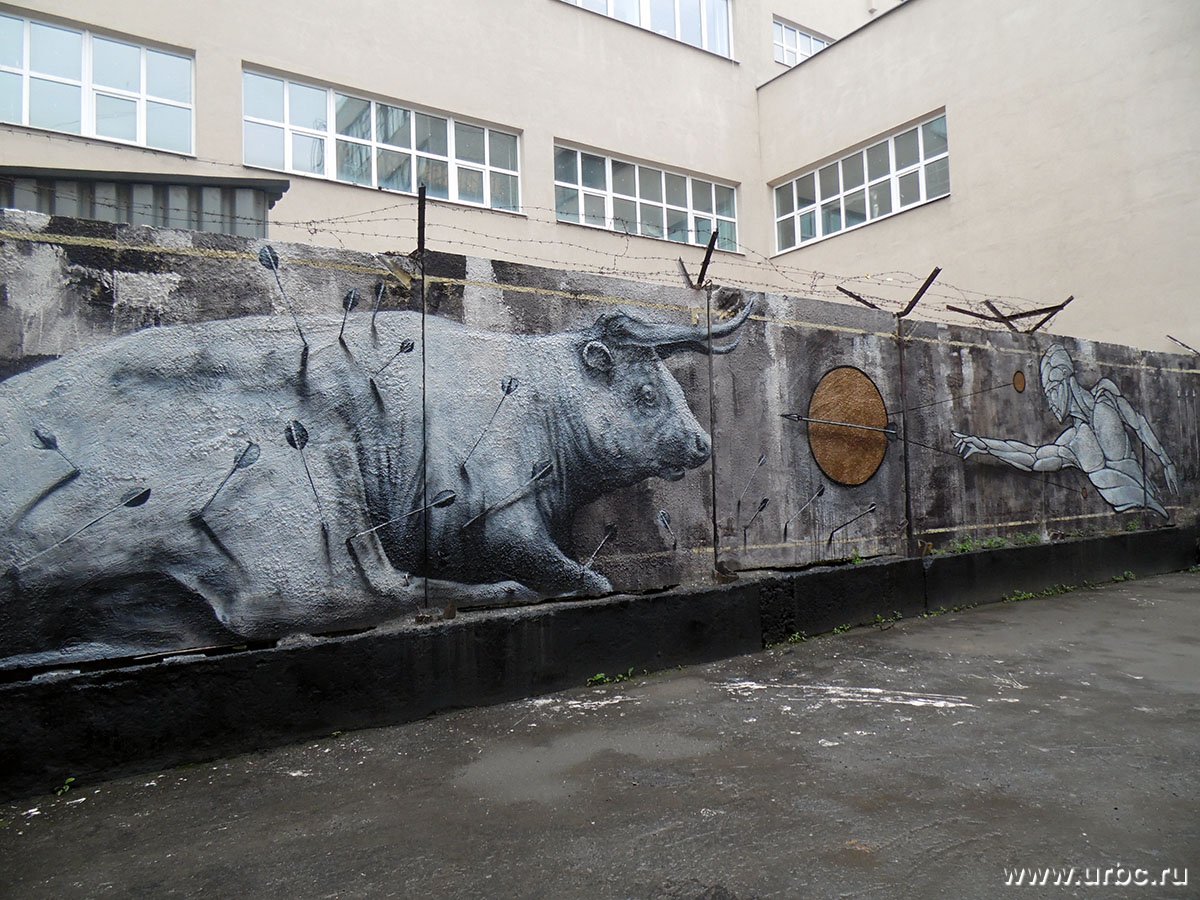 «Идея порисовать на «Доме печати» появилась еще в прошлом году, однако нам это сделать не разрешили ввиду того, что это здание является памятником архитектуры. Однако в этот раз нам удалось заполучить одну из стен здания для нашего фестиваля, и в результате появилась очень интересная работа двух совершенно разных авторов», — рассказали учредители.