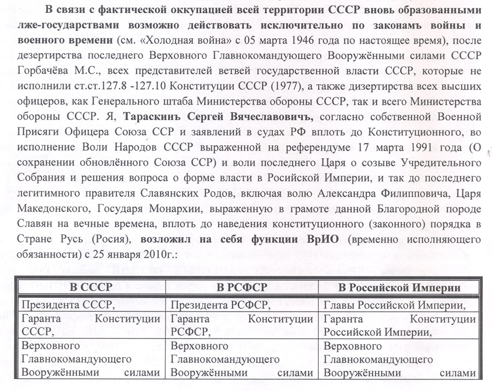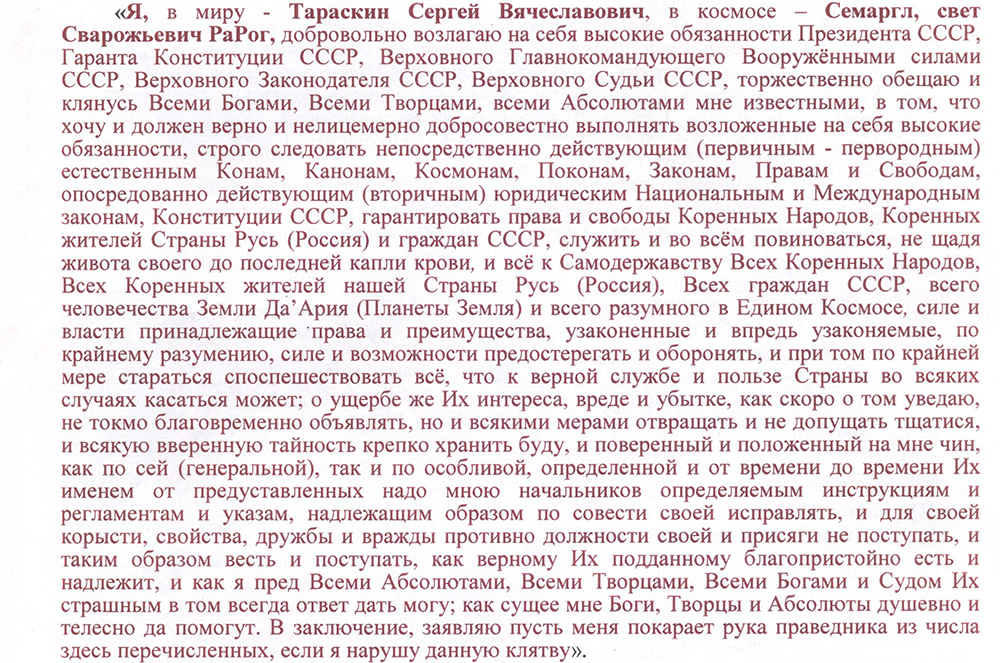 Исходя из собственных заключений, автор доклада возложил на себя полномочия президента СССР, Верховного Главнокомандующего, Верховного судьи и так далее. Читателям доклада Сергей Тараскин представился не только гражданином СССР, но и заодно «Семаргл, свет Сварожьевич РаРог».