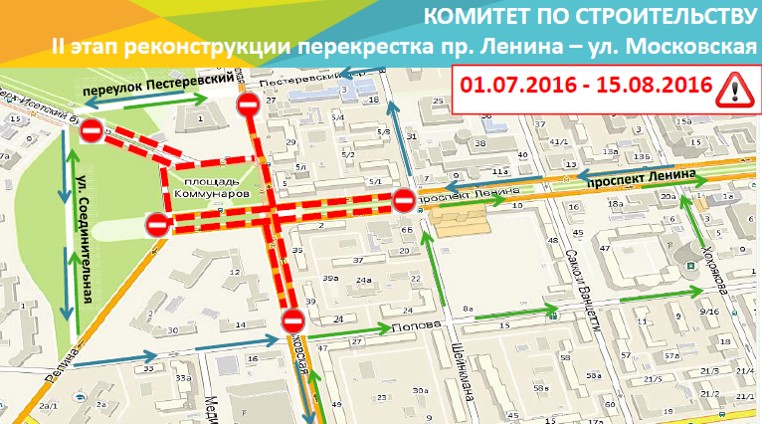 На первом этапе будет закрыто движение трамваев на самом перекрестке Ленина — Московская и по проспекту Ленина от Московской до Луначарского. Это изменение коснется 11 маршрутов трамваев (2, 5, 6, 10, 13, 15, 18, 26, 27, А (31), 32).