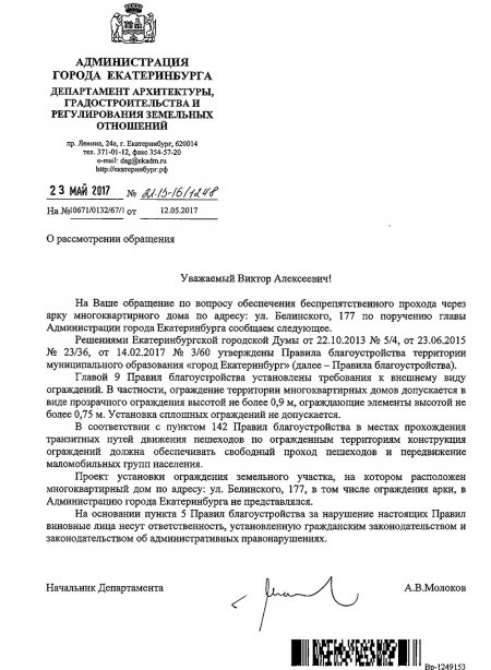 «В ответе на наш запрос от 23 мая текущего года администрация Екатеринбурга снова признала ограждение незаконным и не соответствующим требованиям правил благоустройства, однако реальных действий по его демонтажу власти не предпринимают. Мы написали ряд обращений, в том числе в прокуратуру, но не получили ответа. В конце текущей недели пойдем на прием к главе города, председателю Екатеринбургской городской думы Евгению Ройзману. Мы требуем обеспечить общедоступный проход через арку между домами и предотвратить установку забора и ворот, которые будут мешать быстрому доступу спецтехники, в том числе автомобилей аварийных служб», — рассказала жительница МКД № 175.