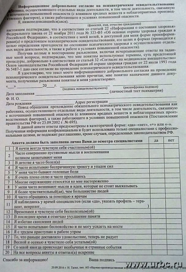 Сотрудникам головного предприятия НПК «Уралвагонзавод» (УВЗ) массово выдают направления на прохождение «обязательного психиатрического освидетельствования работников, осуществляющих деятельность, связанную с источником повышенной опасности (с влиянием вредных веществ и неблагоприятных производственных факторов)». Сначала работникам УВЗ предложили заполнить анкету, где следует ответить на 20 достаточно специфических вопросов. Затем с 1 июля им будет необходимо пройти очный осмотр у психиатра. Представители предприятия опасаются, что полученную информацию в будущем могут использовать в качестве обоснования для сокращения численности штата.Одна из анкет оказалась в распоряжении ИАА «УралБизнесКонсалтинг». На все вопросы необходимо отвечать однозначно: «да» или «нет». Каждый из них направлен на выявление психиатрических отклонений. В частности, можно выделить следующие пункты: «Многие окружающие относятся ко мне настороженно», «У меня часто возникают мысли и идеи, которые не стоит высказывать», «Я избегаю скопления людей», «Часто испытывают беспричинную тревогу и упадок сил», «То, что раньше доставляло мне удовольствие, теперь не радует».