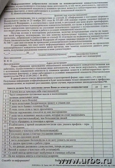 «Не так давно с одним из работников случился припадок. Когда он узнал о сокращении зарплаты, он бросил тряпку с керосином в лицо своему начальнику и поджег. Недавно по всему предприятию стали выдавать такие вот анкеты. Нам сказали, что в обязательном порядке необходимо пройти освидетельствование пригодности у психиатра. Мы спросили: «Зачем все это надо?». Нам ответили: «Если мы будем вас увольнять, то, во-первых, придется вам платить, во-вторых, пострадает авторитет оборонного предприятия. Когда есть заключение психиатра, убрать его проще и легче». Отказ от прохождения освидетельствования переквалифицируется в добровольный отказ от продления своего трудового договора», — заявил УрБК сотрудник одного из цехов «Уралвагонзавода» на условиях анонимности.