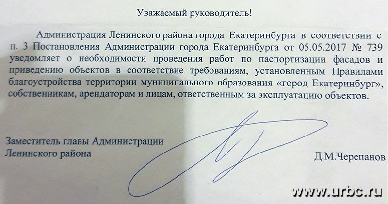 «Администрация Ленинского района города Екатеринбурга в соответствии с п. 3 постановления администрации города Екатеринбурга от 05.05.2017 № 739 уведомляет о необходимости проведения работ по паспортизации фасадов и приведению объектов в соответствие требованиям, установленным правилами благоустройства территории муниципального образования «город Екатеринбург», собственникам, арендаторам и лицам, ответственным за эксплуатацию объектов», — гласит уведомление.