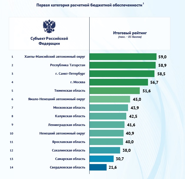Свердловская область в своей категории заняла последнее место с результатом 21,6 балла. На первом находится ХМАО с результатом 59 баллов, на втором — Татарстан с результатом 58,9 балла. Следом идет Санкт-Петербург и Москва.