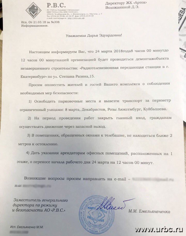 УрБК, Екатеринбург, 21.03.2018. Компания «Работы Взрывные Специальные» написала письмо директору апарт-отеля ARTEK в Екатеринбурге Дарье Воложаниной с просьбой принять меры безопасности 24 марта с 08.00 до 12.00 из-за сноса телебашни. Копия документа имеется в распоряжении УрБК.