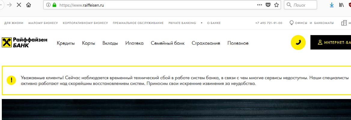 УрБК, Москва, 20.04.2018. В работе Райффайзенбанка произошел технический сбой. Об этом говорится в сообщении на сайте финансово-кредитной организации.