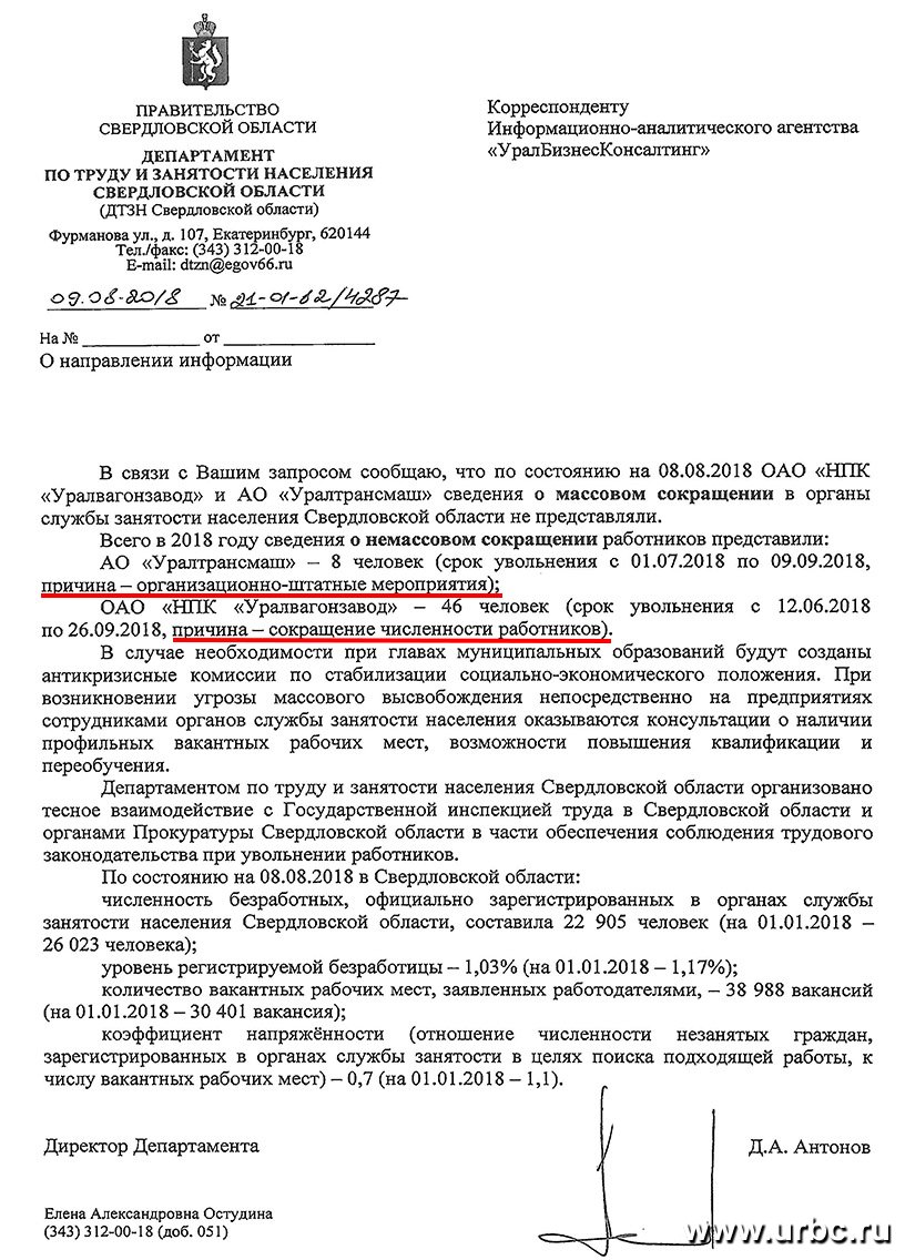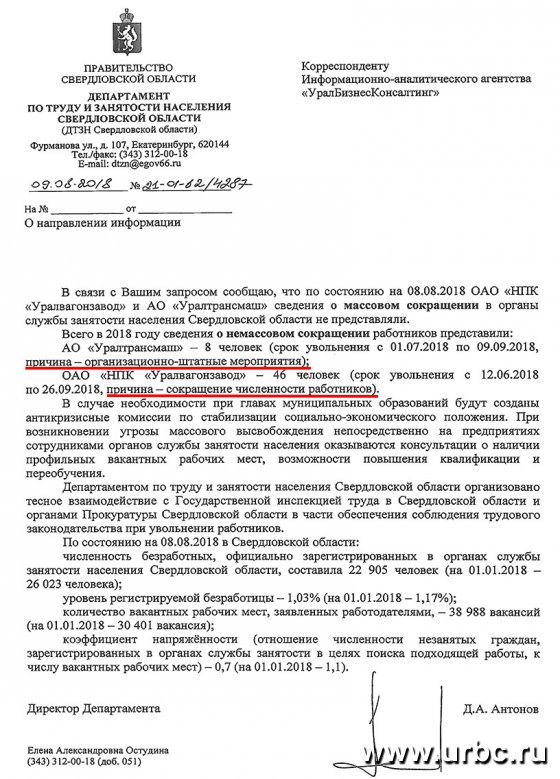 Ответ департамента по труду и занятости Свердловской области на запрос УрБК