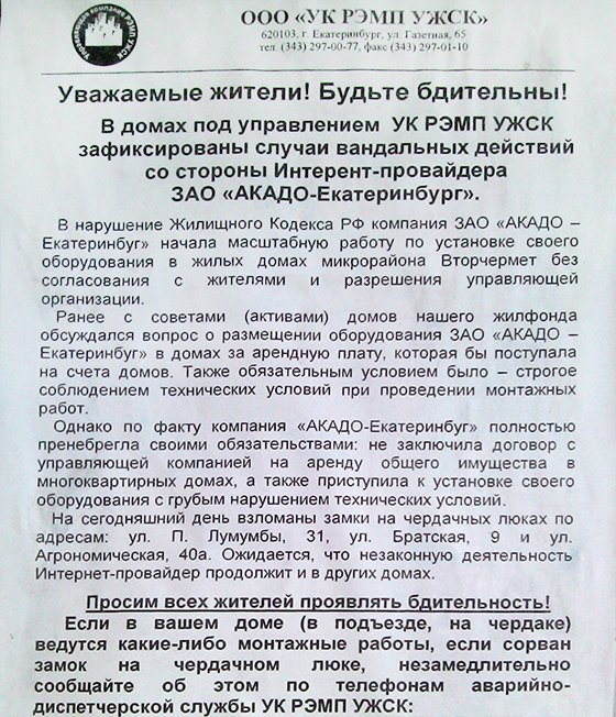 В УралАОС, которая представляет интересы провайдера, утверждают, что требования ЗАО УК «РЭМП Железнодорожного района» незаконны.