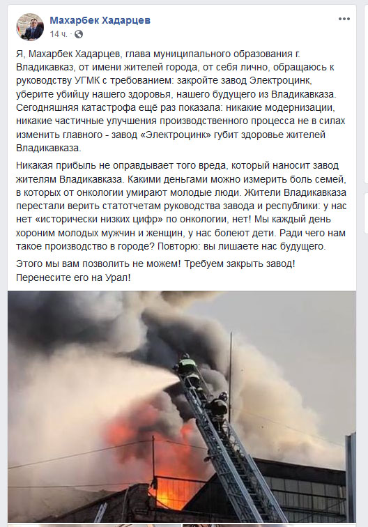 «Сегодняшняя катастрофа еще раз показала: никакие модернизации, никакие частичные улучшения производственного процесса не в силах изменить главного — завод «Электроцинк» губит здоровье жителей Владикавказа. Никакая прибыль не оправдывает того вреда, который наносит завод жителям Владикавказа. Какими деньгами можно измерить боль семей, в которых от онкологии умирают молодые люди? Этого мы вам позволить не можем! Требуем закрыть завод! Перенесите его на Урал!», — написал М. Хадарцев на своей странице в Facebook.