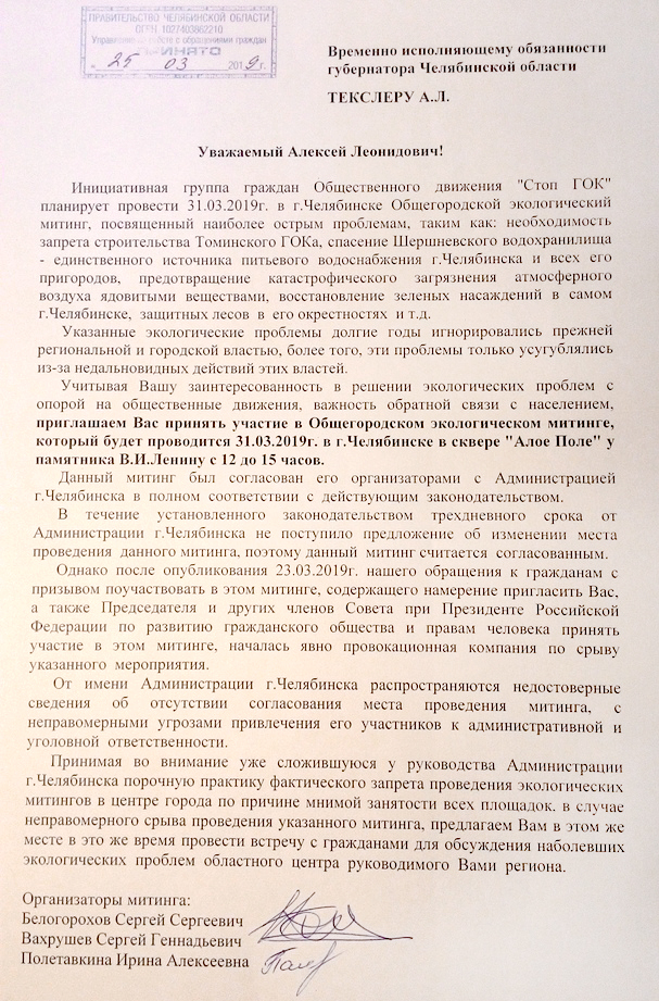 УрБК, Челябинск, 25.03.2019. Врио губернатора Южного Урала Алексей Текслер получил приглашение принять участие 31 марта 2019 года в общегородском экологическом митинге, который устраивает общественное движение «Стоп Гок». Об этом сообщается на страницах движения в социальных сетях.
