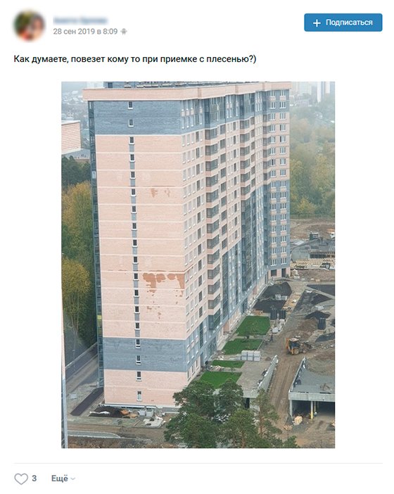 На стене дома второй очереди ЖК «Просторы» в Екатеринбурге появились мокрые подтеки