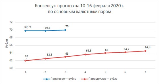 — Наш прогноз на 14 февраля 2020 года: USD — 63,6 руб. за долл., EUR — 69,75 руб. за евро, пара EUR/USD — 1,10 долл. США за евро. Фондовые индексы: IMOEX — 3080 пунктов, IRTS — 1530 пунктов.