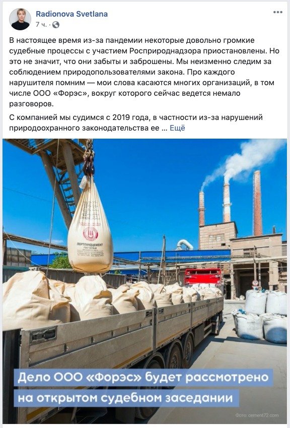 УрБК, Москва, 28.04.2020. Судебное разбирательство между Росприроднадзором и компанией «ФОРЭС», а также Староцементным заводом из города Сухой Лог пройдет в открытом режиме. Об этом на своей странице в социальной сети Facebook сообщила глава Росприроднадзора Светлана Радионова.