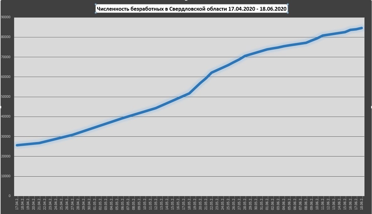 Накануне уровень официально зарегистрированных безработных на Среднем Урале побил рекорд десятилетней давности, достигнув показателя 3,99%. На сегодня цифры составляют уже 4,02%. К 19 июня 2020 года на биржу труда встали свыше 85 тыс. человек. С учетом числа граждан, которые не обращались в центры занятости, эти цифры могут быть выше официальных данных как минимум в два раза. При этом, судя по графику роста безработицы и по оценкам экспертов, рекорды будут обновляться изо дня в день продолжительное время.Как ранее писал УрБК, резкий рост безработицы в Свердловской области наблюдается с конца апреля 2020 года. Если на 1 января 2020 года в регионе насчитывалось 22 тыс. официально зарегистрированных безработных, уже к 27 апреля эта цифра составляла более 30 тыс. человек. В течение мая численность жителей региона, оставшихся без работы, выросла более чем в 2 раза, составив 73 тыс. 968 человек (по состоянию на 1 июня 2020 года). В течение июня центры занятости зарегистрировали еще 11 тыс. 287 человек. Динамику развития ситуации на рынке труда можно подробнее рассмотреть на графике, подготовленном УрБК.