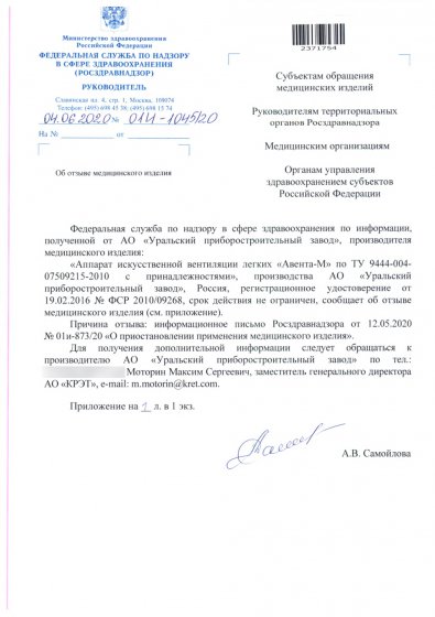 Ранее стало известно, что Росздравнадзор выявил нарушения при производстве аппаратов ИВЛ на УПЗ. Поводом для проверки послужили возгорания аппаратов ИВЛ «Авента-М» в больницах Москвы и Санкт-Петербурга, после которых эксплуатация аналогичных аппаратов по всей стране была приостановлена. От партии ИВЛ «Авента-М» отказались и в США, куда они были поставлены в рамках помощи в борьбе с коронавирусом.