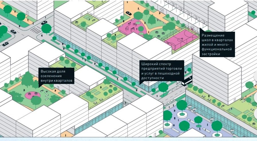 Для моделей высокой этажности с усиленной плотностью застройки рекомендуется строить школы компактно к прилегающим домам.