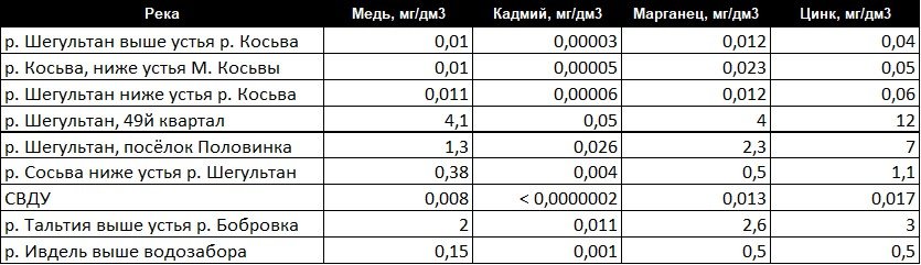 Как следует из представленных данных, наибольший уровень загрязнения наблюдается в реке Шегультан (49-й квартал): по меди — 4,1 мг/дм3, марганец — 4 мг/дм3, цинк — 12 мг/дм3. В реке Шегультан в поселке Половинка: по меди — 1,3 мг/дм3, марганец — 2,3 мг/дм3, цинк — 7 мг/дм3.