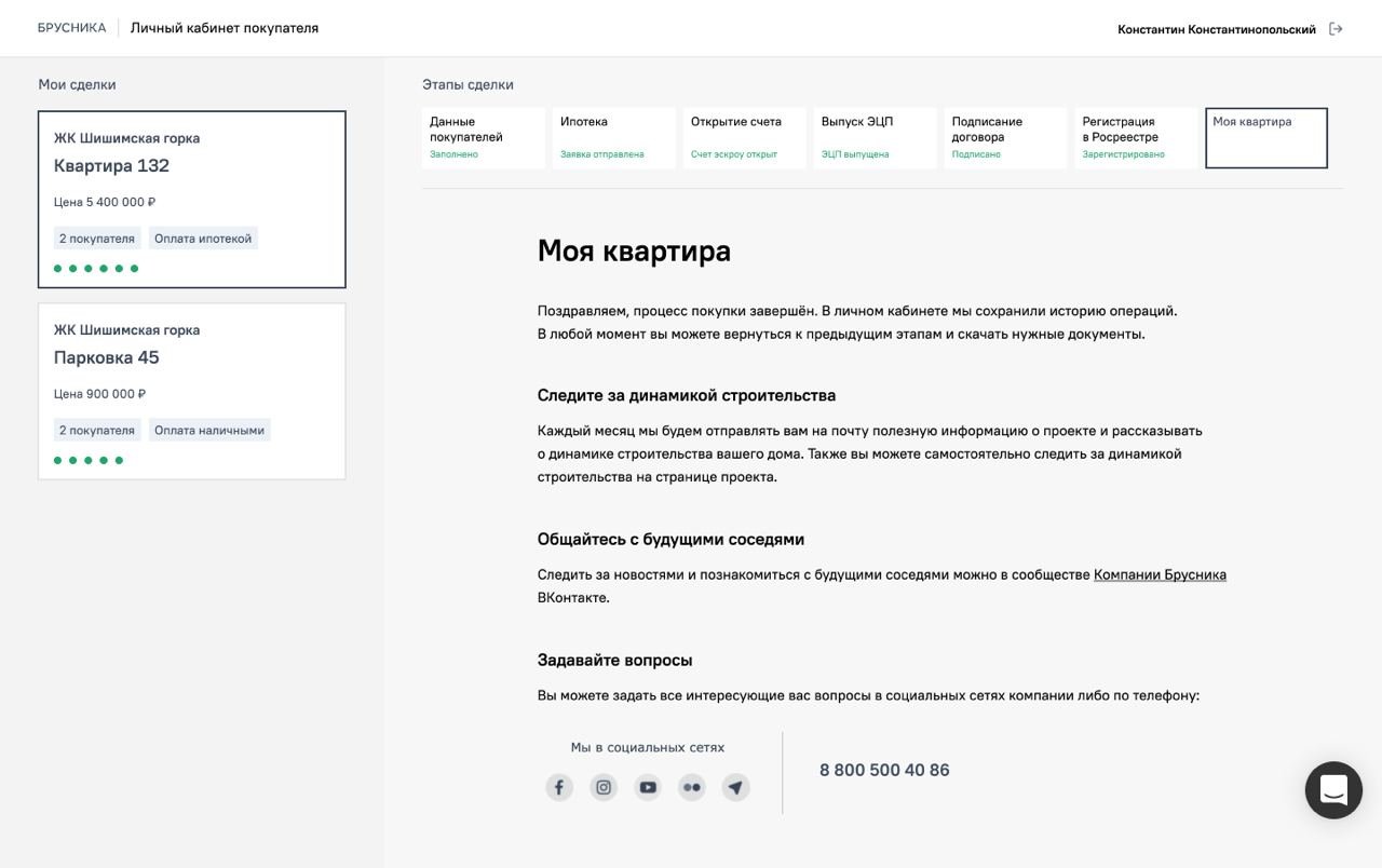 Отмечается, что все последующие этапы покупки от открытия эскроу-счета до регистрации договора в Росреестре также автоматизированы. Документы клиенты заверили с помощью электронной подписи. При этом специалист Брусники сопровождал покупателей на каждом этапе сделки через личный кабинет.