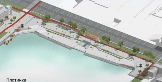 «Мы видим в проекте пологие пандусы на Плотинке, которые позволяют спуститься к воде и подняться вновь, террасирование и стрампы (пандус, интегрированный в лестницу) у Драмтеатра», — отмечают авторы.