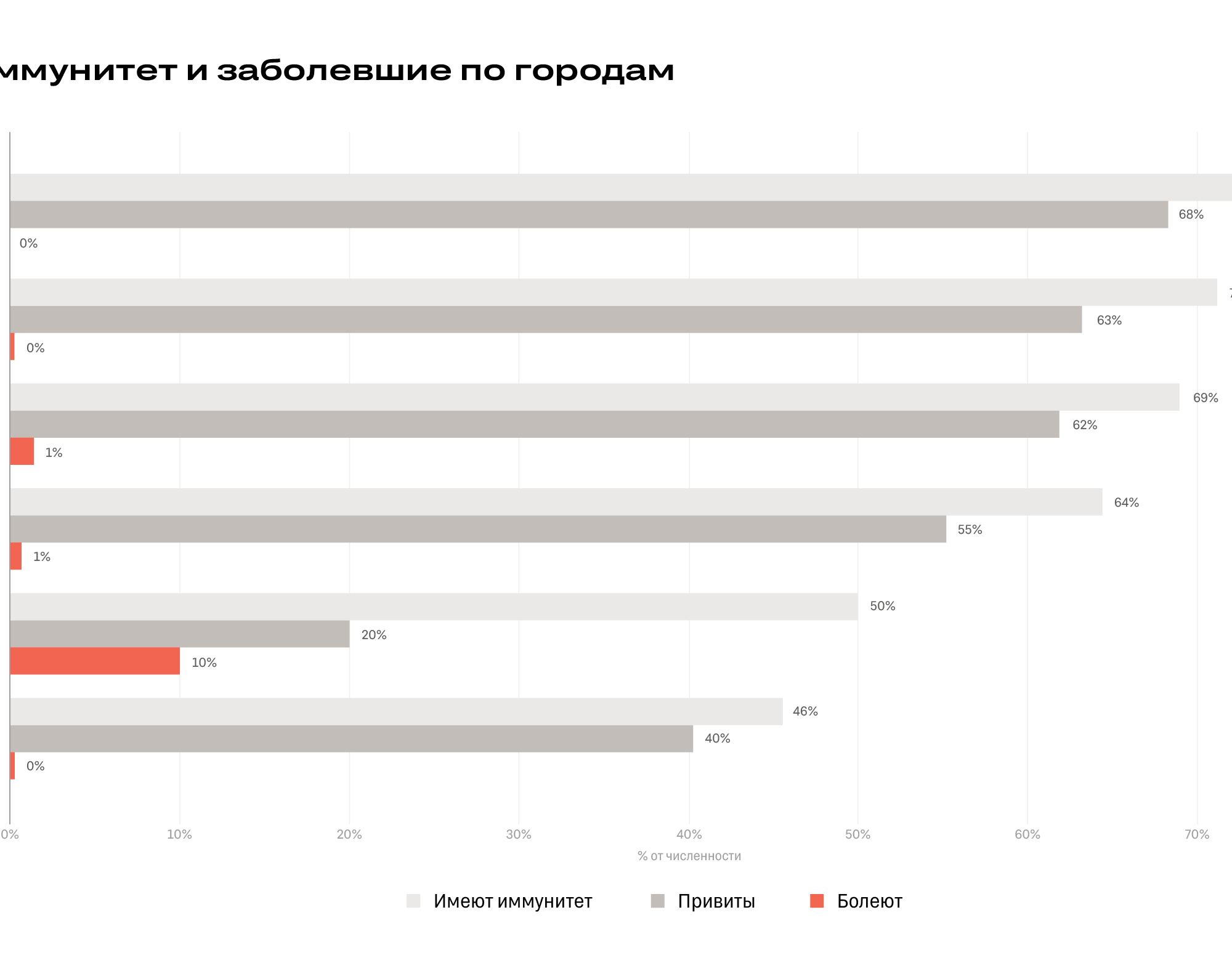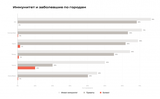 В разрезе городов присутствия Брусники наиболее высокий уровень коллективного иммунитета зафиксирован в Видном (Московская область) и Екатеринбурге — 76% и 71% соответственно.