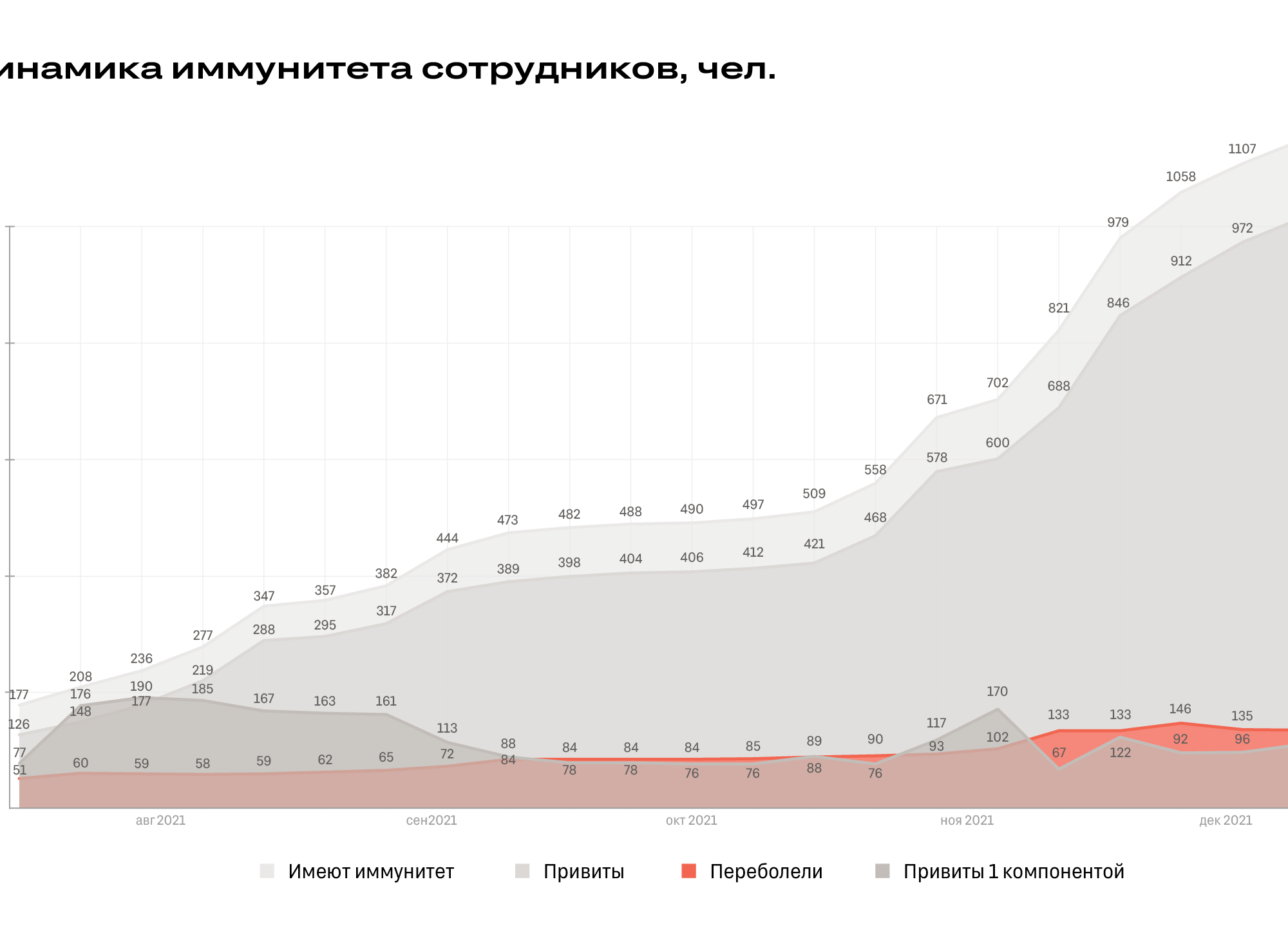 Статистику по COVID-19 компания начала отслеживать в июле. Тогда показатель иммунитета составлял около 11%. С начала кампании прививку поставили 916 сотрудников. Резкий скачок по числу вакцинированных произошел в ноябре, за месяц оно увеличилось почти на 400 человек.