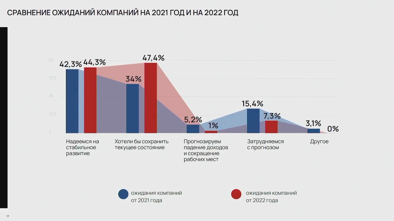 Добавим, что в финале исследования приводятся прогнозы бизнеса уже на 2022 год. Надежду на стабильное развитие выразили 44,3% респондентов. Вариант «хотели бы сохранить текущее состояние» выбрали 47,4% опрошенных. Ожидает падения доходов и сокращения рабочих мест 1%. Затруднились с прогнозом 7,3%.