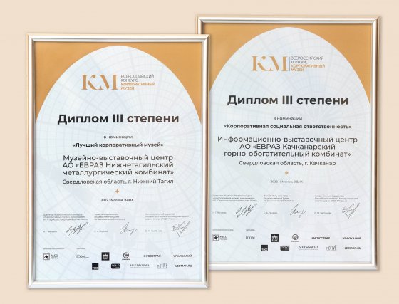УрБК, Екатеринбург, 03.06.2022. Музейно-выставочные центры ЕВРАЗ НТМК и ЕВРАЗ КГОК получили звания лауреатов III степени на IV Всероссийском конкурсе «Корпоративный музей». ЕВРАЗ НТМК также был отмечен в номинации «Лучший корпоративный музей», Качканарский ГОК — в разделе «Корпоративная социальная ответственность». Очная защита проектов прошла в Москве, сообщает региональный центр корпоративных отношений «Урал» металлургического предприятия.