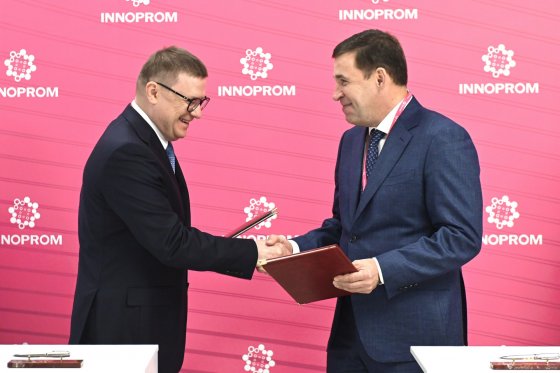 УрБК, Екатеринбург, 05.07.2022. Губернатор Свердловской области Евгений Куйвашев, глава Екатеринбурга Алексей Орлов и начальник Свердловской железной дороги Иван Колесников заключили трехстороннее соглашение о создании Новокольцовского маршрута. Подписание документов состоялось в ходе XII международной промышленной выставки «Иннопром-2022».