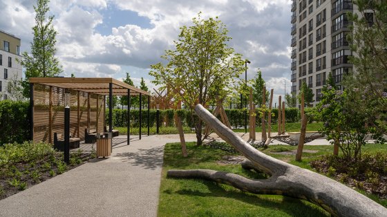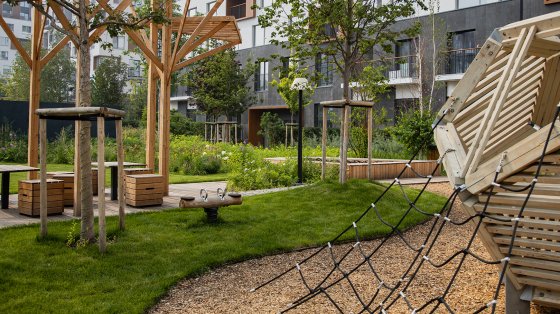 Дворы первых зданий будут закрыты, чтобы обеспечить спокойный отдых. Там оборудуют детские площадки, лаунж-зоны, зоны для пикника и воркаута, а также вырастят газоны. Причем детские зоны проектируются на основе крупного исследования, которое застройщик провел с компанией AFA в 2018 году. Согласно нему, необходимо дать юному поколению реализовать восемь основных активностей, включающих в себя игру, общение, движение и другие. Вдобавок вместо не имеющего игровой ценности резинового покрытия будет использоваться сыпучее.