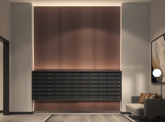 Входы в подъезды домов будут прозрачными и располагаться на уровне земли. Домофоны разместят в тамбуре, чтобы не пришлось мерзнуть в ожидании открытия двери. Цветовые решения внутри зданий будут соответствовать фасадам. Полы выполнят из керамогранита светло-серого оттенка. Цвета стен будут соответствовать тону, а утопленные в стену почтовые ящики будут иметь гармоничные темные цвета. Перед ними разместят небольшие диваны.