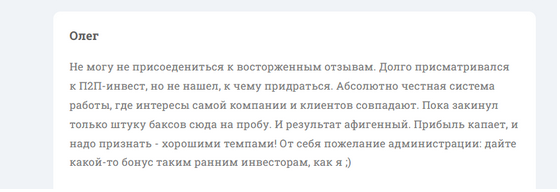 И это радует. Однако для того, чтобы картина получилась максимально полной, не помешает присоединить несколько отзывов о P2P Invest для примера.