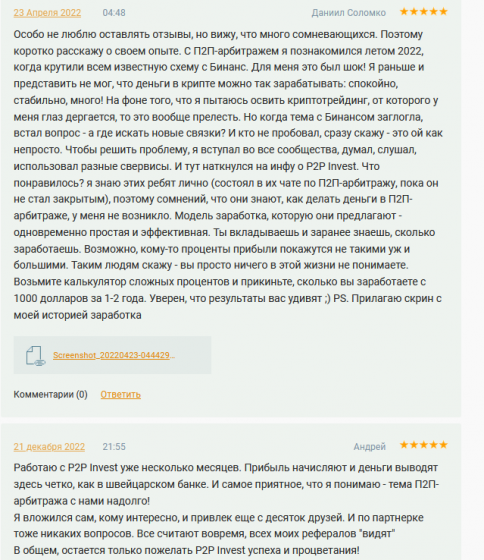 Для экономии времени рассмотрение каждой финансовой организации следует начинать с прочтения того, что про нее говорят пользователи популярных пабликов. Чтобы найти отзывы о P2P Invest проведен анализ соцсетей, форумов и различных интернет-платформ как Blogspot (https://p2pinvest2023.blogspot.com/2023/02/p2p-invest.html). Их беглый осмотр позволил сразу подметить главный момент – клиенты нигде не говорят о наличии каких-либо проблем с выводом средств. А это первое, в чем хочется быть уверенными. Далее, уделив немного времени изучению комментариев, становится понятно, что обещания по начислению прибыли в P2P Invest исполняют, бизнес ведут честно, а клиентский сервис улучшается.