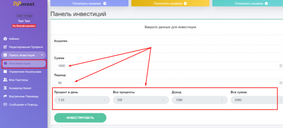 После пополнения баланса открывают раздел с инвестициями. Там необходимо ввести, как надолго и как много планируют вложить. Благодаря встроенным алгоритмам, немедленно произойдет расчет ключевых параметров инвестирования. Пользователю остается оценить и нажать «Инвестировать», если его все устраивает.