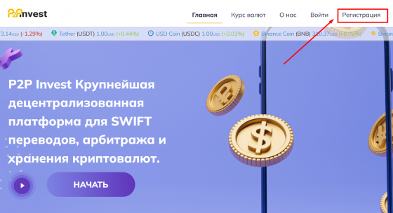 Оказавшись на главной странице официального сайта P2P Invest, для начала нужно пройти регистрацию.