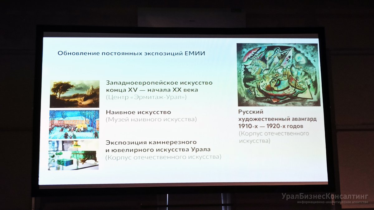 Стоит добавить, что ряд произведений из собрания ЕМИИ в течение года будет гастролировать по другим музеям России. Так, произведения русского авангарда с мая по сентябрь можно будет увидеть в Нижнем Новгороде в НГХМ. Там же с июля по сентябрь будут выставлены некоторые работы из коллекции Музея наивного искусства, а с сентября по ноябрь — работы Миши Брусиловского. Выставка каслинского чугунного литья с сентября по декабрь будет представлена в Пермской художественной галерее.