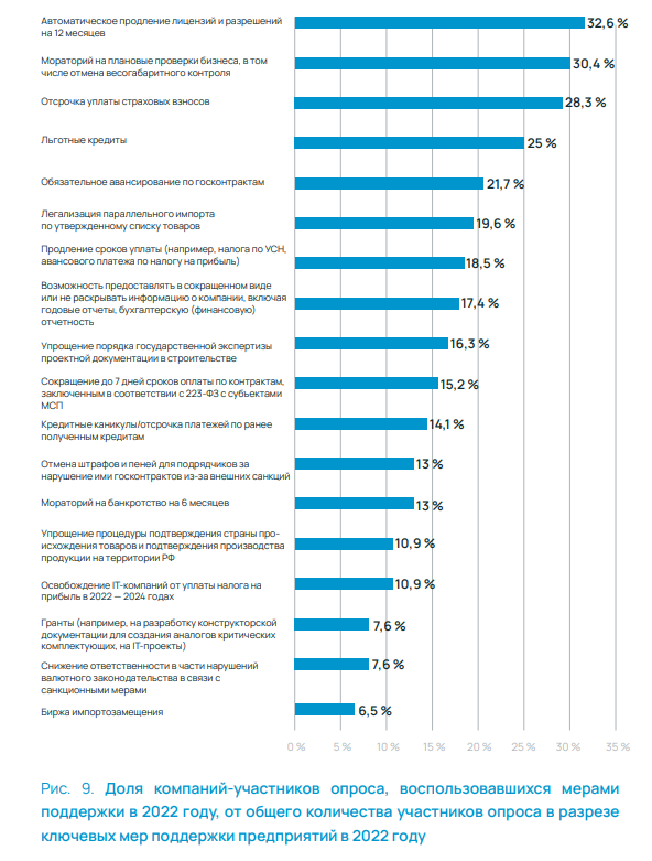 Если возвращаться к исследованию, то респондентов также попросили оценить меры поддержки, рассказать, какие были наиболее и наименее востребованы, почему к каким-то из них в итоге не стали прибегать. Авторы опроса на основании полученных ответов приходят к выводу, что спрос на меры поддержки был: 78% опрошенных пользовались хотя бы одной. Самыми популярными оказались автоматическое продление лицензий и разрешений, мораторий на проверки, отсрочка уплаты страховых взносов. Наименее — биржа импортозамещения, снижение ответственности за нарушение валютного законодательства, гранты. Все они были слишком локальны, поэтому ими пользовались немногие предприятия.