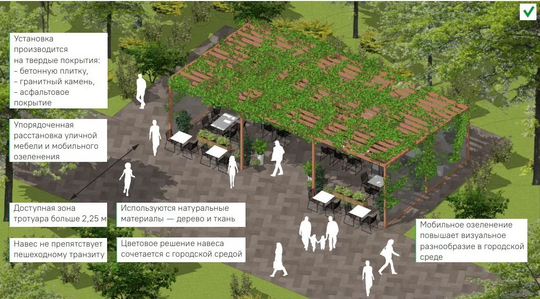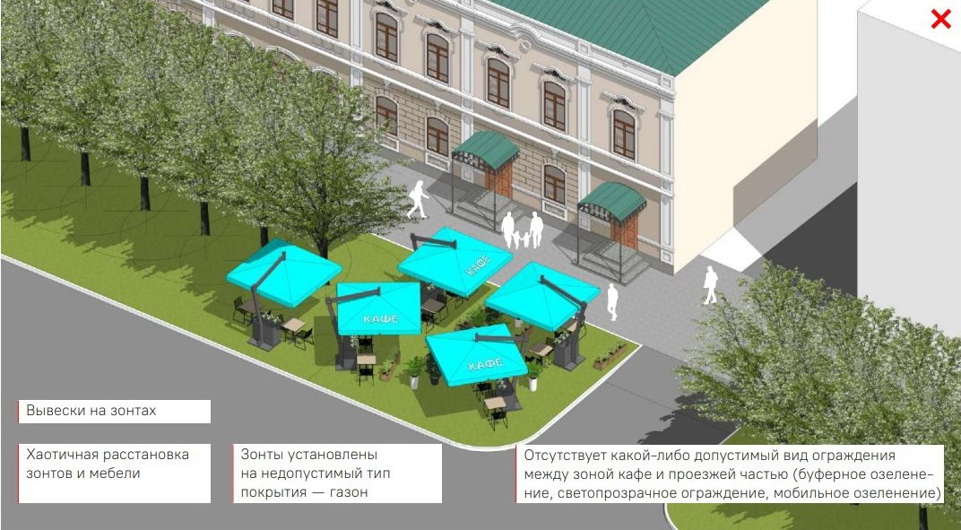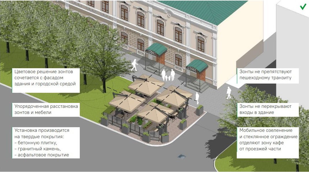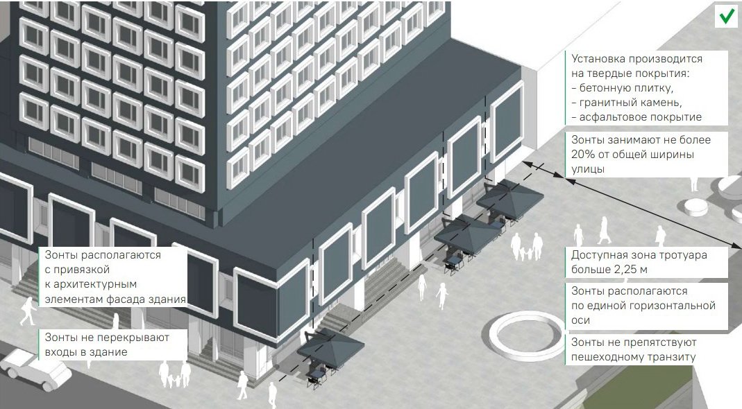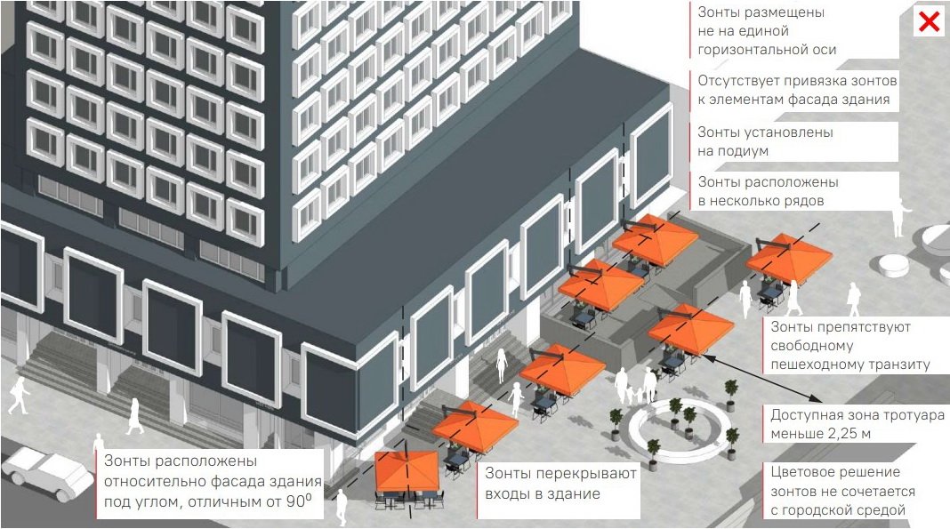 Так, например, в документе указывается, что зонты должны размещаться вдоль зданий с привязкой к фасадным элементам, а маркизы — располагаться по единой горизонтальной оси на одной высоте. При этом ширина свободной части тротуара после установки объекта должна быть не менее 2,25 м. Также запрещается установка столиков и стульев в два ряда.