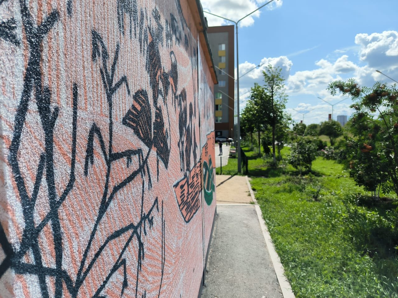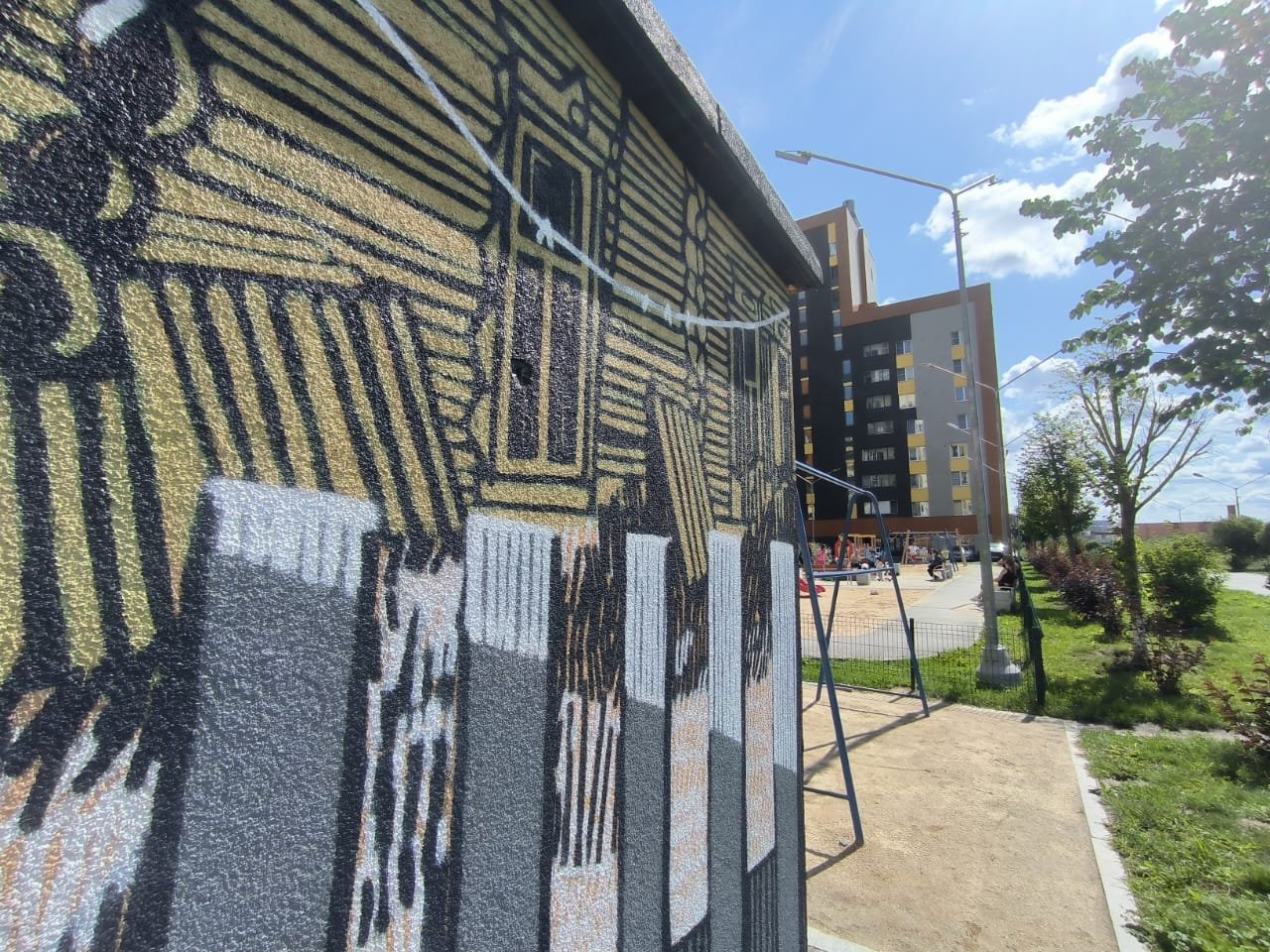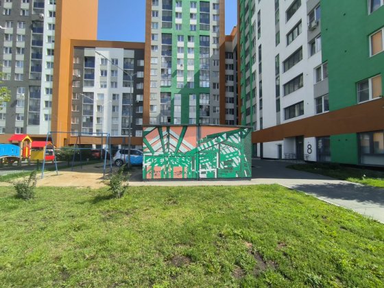«Эта идея у меня родилась, когда я смотрел на высотные здания, новый район. Он красивый и семейный, но ему не хватает чего-то живого. Изначально я планировал нарисовать горы, но потом отказался от этой идеи. И выбрал вот такую деревенскую серию, ведь город и деревня — это всегда противоположности. Поэтому мне захотелось добавить теплого контраста району», — поделился художник.