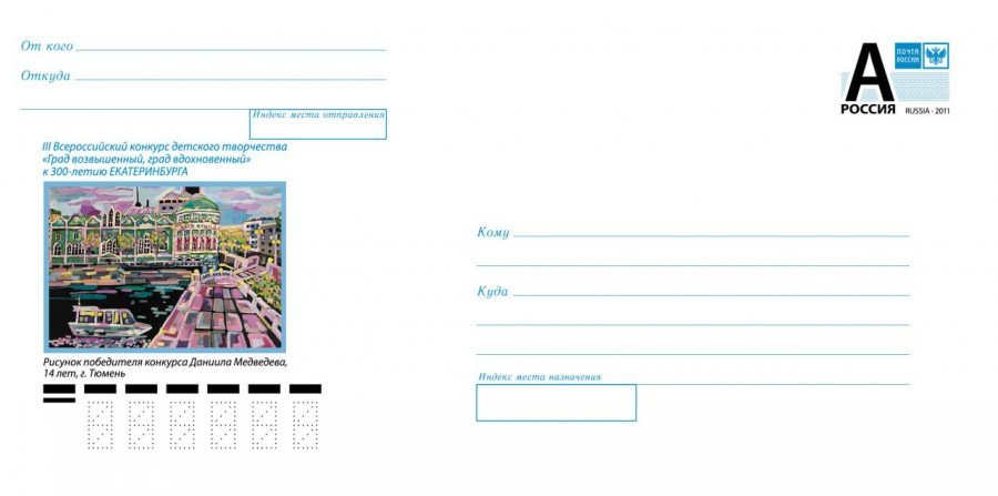 Рисунок молодого художника Даниила Медведева победил в конкурсе «Град возвышенный, град вдохновенный», организованном властями Екатеринбурга совместно с «Почтой России». Конверт выпущен партией в 200 тыс. экземпляров.
