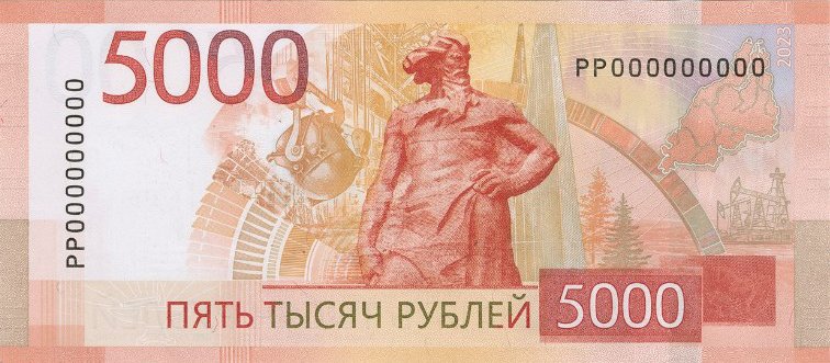 Пятитысячная банкнота посвящена Екатеринбургу и Уральскому федеральному округу. Основное изображение лицевой стороны — стела «Европа-Азия». Также на ней представлен ряд других узнаваемых зданий города — цирк, дом Севастьянова, гостиница «Исеть», Главпочтамт, колесо обозрения, ДИВС и несколько небоскребов. На оборотной стороне изображены памятник «Сказ об Урале» в Челябинске и стела «66-параллель» в Салехарде.