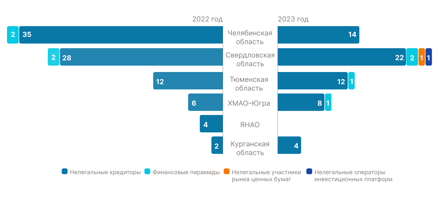 Больше всего таких организаций, среди которых четыре финансовые пирамиды, было обнаружено в Свердловской, Челябинской и Тюменской областях. Также на Среднем Урале были выявлены нелегальный участник рынка ценных бумаг и оператор инвестиционной платформы. Единственным регионом округа, где в 2023 году не нашли нелегалов, стал ЯНАО.