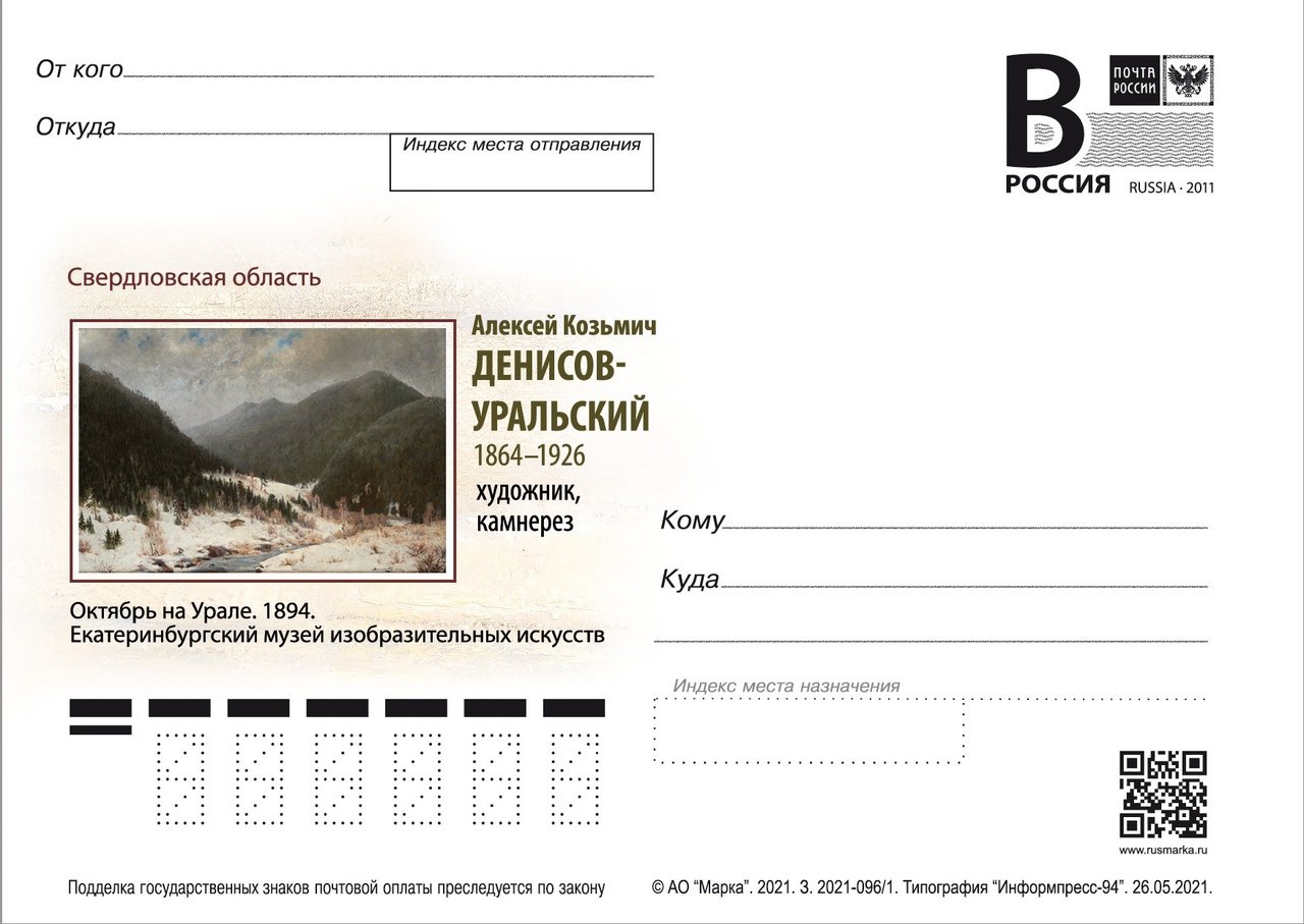 Юбилейная карточка была погашена почтовым штемпелем «Гордость Урала». Посткарты в честь одного из первых популяризаторов Урала автора многочисленных полотен с уральскими пейзажами выпустили по инициативе ЕМИИ. На них изображена картина художника «Октябрь на Урале» (1894) из коллекции ЕМИИ с узнаваемым уральским горным ландшафтом.